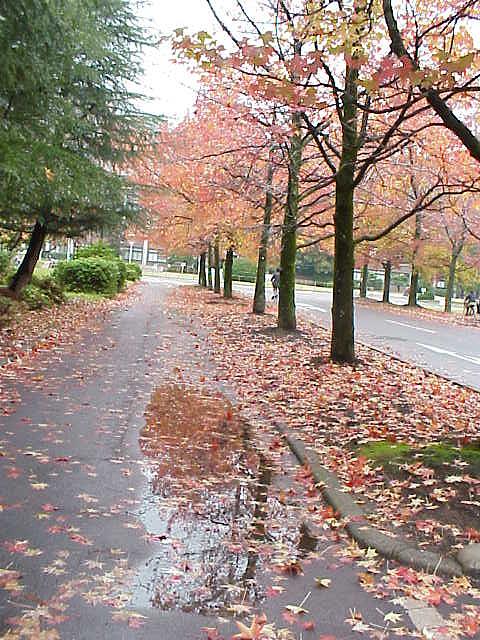 寒気と雨の影響で紅葉も本格化。枝についた紅葉から地面に落ちた葉の美しさを鑑賞する季節になってきた。雨上がりの水たまりを狙った写真。 |