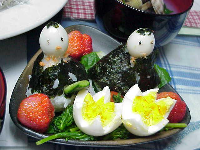 娘の作った雛人形のおにぎり。昨年のおにぎりはこちら。 |