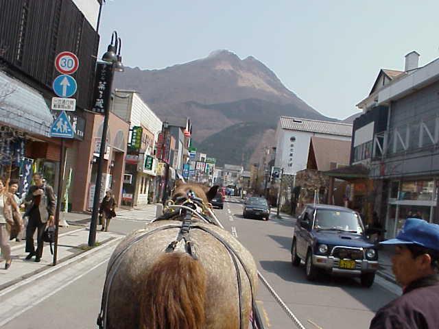 湯布院の観光辻馬車から眺める由布岳。湯布院は、これまで10数回訪れているが、一度ぐらいは乗りたいと思っていた馬車に初めて乗ることができた。馬のシッポの眺めよりも、馬車が走る風景を撮ったほうが雰囲気が出たかもしれない。