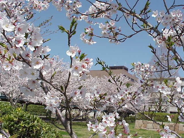 文学部中庭の桜。年々、木が成長し見事な花をつけるようになった。すでに満開をすぎて花が散りかけているが、4/9の入学式までは何とか持ちこたえそうだ。 |