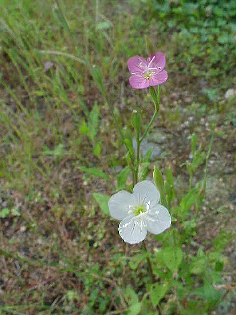 5月からずっと咲き続けている「赤花夕化粧」という草花(もともとは園芸植物だが、いまや雑草化している)の中に、白花があるとの情報が同僚から伝えられた。上京などの用事が重なってなかなか実物を見ることができなかったのだが、6/7の朝やっと確認。これって、どのぐらいの希少価値があるのだろうか。後方は普通の赤花。 |