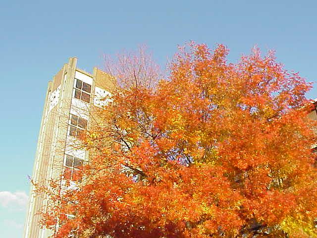 時計台横の楷の木の紅葉もそろそろ終わりに近づいてきた。この種類は赤から黄色への変化が面白い。ちなみに、時計台の両側にある楷の木はいずれもメスの木。よく見ると少しばかり実がなっている。もし一方がオスの木だとすると実がなりすぎてこれほど美しい紅葉は見られなかったのではないかと思われる。 |