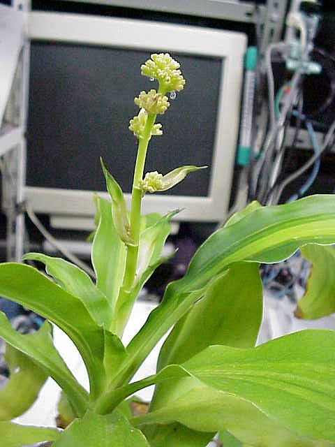 研究室に置いてあったドラセナが花芽をつけた。ドラセナは花屋さんでは「幸福の木」として売られている。ということはこの花は「幸福の花」か。 |