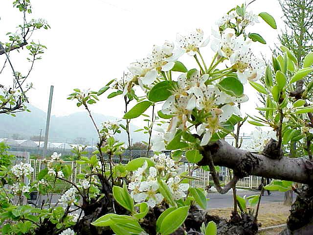 洋梨の花。写真は4/8に撮影したもので4/13時点では殆ど散ってしまった。桜に比べると花弁が離れており、雄しべの先が黒いのが特徴。 |