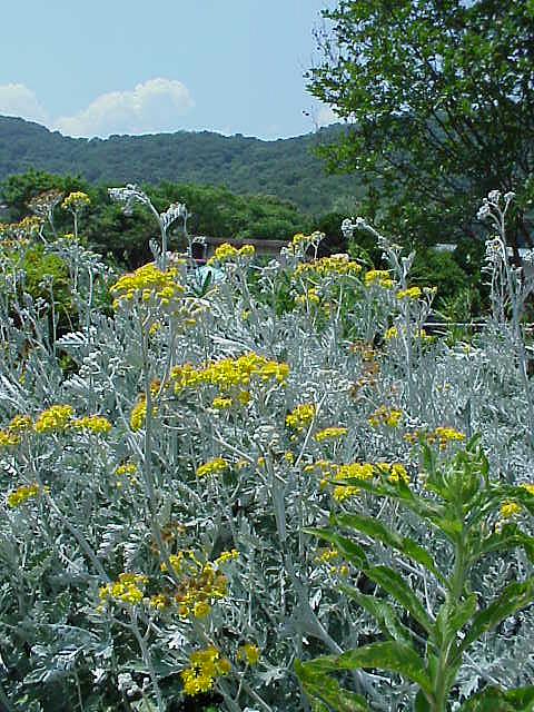 シロタエギク。コンテナ・ガーデンの引き立て役として重宝だが、いったん根がはると、旺盛に枝を伸ばし、周囲の草花を圧迫するほどに育つ。写真は、文学部西側。後ろの半田山にはすでに真夏の日差し。 |