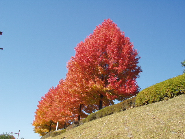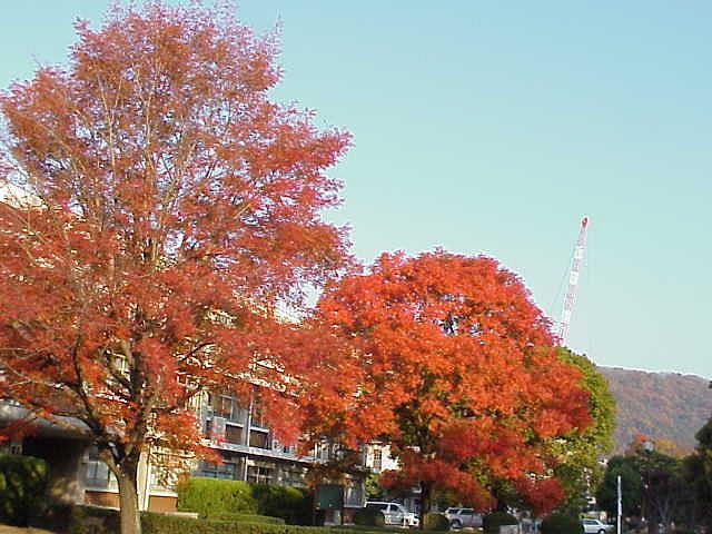 農学部前の楷の木(写真左)が燃えるような鮮やかな紅葉を見せている。もっとも、すでに落葉が始まっており、1日ごとに異なった姿を見せる(写真は11/18朝撮影)。今週末まで保つかどうか分からない。右の写真は先日、県外某所で撮影したもので、アメリカフウのようにも見えるが確認できなかった。撮影場所が分かる方はスゴイ!