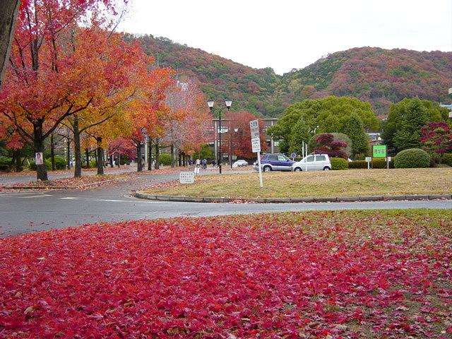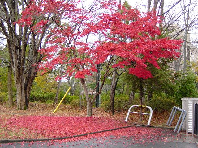 岡大西門東側にあるモミジ。雨で半分ほど葉が落ちて真っ赤な絨毯ができた。