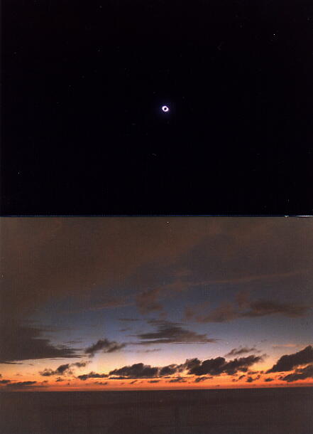 ライブ中継で眺める皆既日食と、全身で受け止める皆既日食 夕刻、他の方のWeb日記にオーストラリア等で見られる皆既日食のライブ中継のことが書かれてあった。すでに外は真っ暗になっており、オーストラリアは日本と経度が同じだからもう終わってしまっているに違いないと思ったが、念のためリンクをたどってみると、日本時間で18時10分台であることに気づく。おかしいなあと思ったが、よく考えれば現地はいま夏至に近い。まだ日没には間があったのである。 さっそく、ライブ中継サイトに繋いで日食の様子を眺めた。直前に何度か雲で隠されヒヤヒヤしたが、皆既食が始まる直前からは雲も切れ、皆既食終了までのすべてを眺めることができた。中継担当者は知らなかったのだろうか。セッティングの会話が聞こえ、逆に臨場感をもたらしていた。今回は皆既食継続時間が32秒と比較的短かったが、そのぶん、すれすれに隠された太陽の縁から全方位に向かってプロミネンスが見えたらしい。いままでで一番美しいとの声も聞こえてきた。 これまでライブ中継などというと、ネットが混雑していてどうせアクセスできないだろうとか、途中で切断されてしまうだろう、などとの思いこみがあり、滅多に利用したことがなかったが、こんなに身近に利用できるとは思わなかった。コロナを眺めるだけだったら、何十万もの旅費を投じて現地に行かなくても済みそうだ。 もっとも、こういった画面いっぱいのコロナを見ても、今ひとつ物足りないところがある。98年8月23日の日記や99年1月14日の日記に書いたように、皆既日食見物の醍醐味は、真っ昼間の景色が急速に暗くなっていく変化にある。皆既日食の瞬間を望遠鏡で眺めるだけだったらテレビやインターネットの画像でも大して変わりはない。写真なども他の人の撮影したものを見せてもらえば済む。しかし、大空全体を肉眼で見渡すことは、現地に行かないとなかなか体験できない。 上掲の右の写真は、小笠原沖の皆既日食の時に20mm広角レンズで撮影した写真である。太陽が真上にあったため2枚を合成してみたが、日食の最中のだいたいの雰囲気はこれで伝わると思う。天頂付近は、コロナを輝かせる太陽と金星や水星などの内惑星、水平線はどの方角も夕焼けのように赤く染まる。私が見たいのは、こういう空いっぱいの景色であって、拡大されたコロナの写真ではない。天文現象を全身で受け止めるには、対象となる天体だけに目を向けていてはダメだ。空全体や地上(海上)全体の中で感じ取る必要がある。できればこういう、現地の景色全体のライブ中継を実現してもらいたいところだが、どんなもんだろうか。 ヘールボップ彗星が近づいた時も、私は、彗星の拡大写真よりは、見慣れた風景と彗星との組み合わせに関心があった。チベットで花の写真を撮る時も、接写よりは、周囲や遠くの雪山を背景に入れたほうが面白いと思う。これは人間の行動についても言えることだろう。1つの行動だけに目を向けるのではなく全人的にとらえるということ、分析ばかりでなく全体や関係性を重視する必要があるということを強く感じるこのごろである。 |