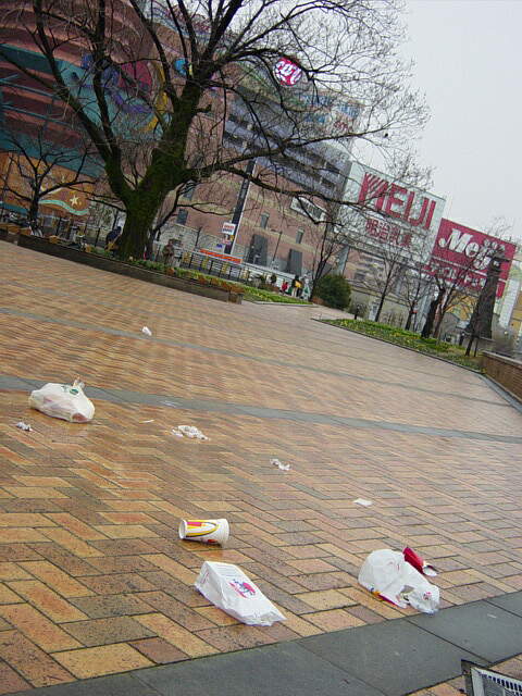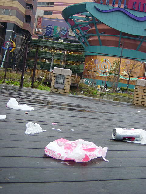博多のcanal city近くの那珂川河岸。canal city自体は美しい所だったが、周辺はゴミだらけでウンザリした。第一印象は「ゴミの多い町」。ついでながら、雨が上がった2/16午前には、各所にビニール傘が捨てられているのを目撃。傘というのは雨がやんだら捨てるものなのか。