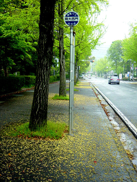 | 岡大南北通りの銀杏の雄花が歩道に絨毯を作っている。4月下旬に短期間みられるだけの風物詩。昨年4月18日の日記にも写真あり。 |