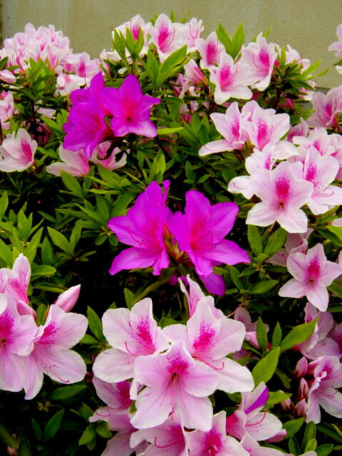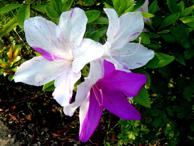 大学構内のツツジが例年になく多くの花をつけている。そんななか、同じ枝に違う色や模様の花をつけている株をみつけた。オシロイバナではしばしばこういう現象が見られるが、ツツジでこのことに気づいたのは今回が初めて。