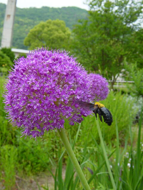 | ギガンティウム(アリウム・ギガンティウムAllium giganteum、あるいはハナネギ)が今年も花をつけた。この花がひときわ目立つのは、それ自身の色ではない。背景の新緑と補色関係にあるためだと気づいた。 |