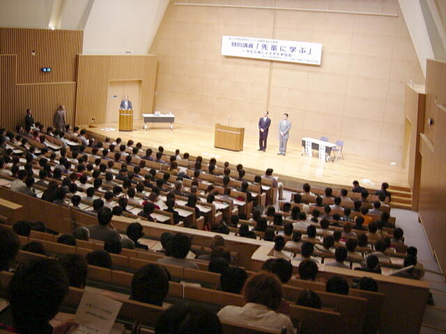 “特別講義『先輩に学ぶ』〜学生企画による学生参加型〜”(岡山大学教育開発センター、岡山大学学生・教員FD検討会の共催)が、5月26日の10時15分から12時10分まで、岡山大学創立五十周年記念館・多目的ホールにて行われた。1コマ目の授業を終えて10時25分頃に会場に入ってみたところ、400人収容のホールはすでに満員、立ち見席が出るほどであった。ちなみに、この行事は、完成したばかりの五十周年記念館の最初のイベントということになる。