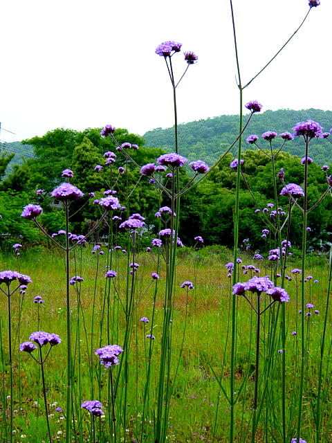 | サンジャクバーベナ。山間部の景色のように見えるが、ここも岡大構内。半田山を借景にした「岡大七景」の1つに加えたいスポットだ。 |