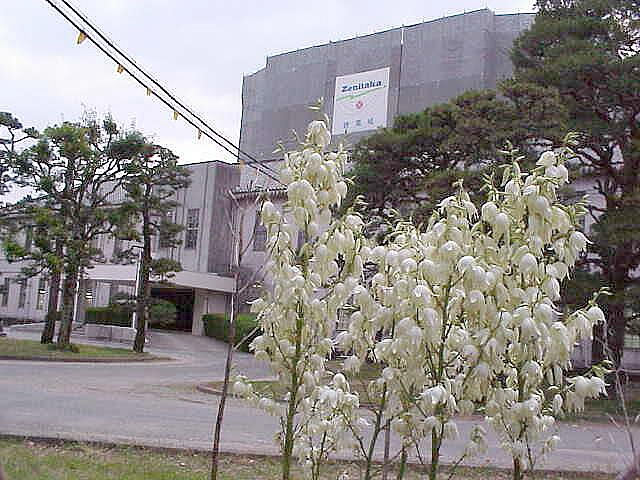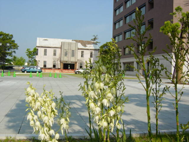 昨年6月16日の日記で、解体予定の岡大・事務局棟と新築の本部棟を背景にしたユッカの花の写真を掲載した(写真右を参照)。その後、ユッカは南に100mほど離れた場所に移植された。いっぽう解体されるはずだった事務局棟(旧・日本軍師団司令部)も部分的に移築保存されることになったので、結果的に、左側の写真のような形でユッカの花と旧司令部棟が「再会」することになった。