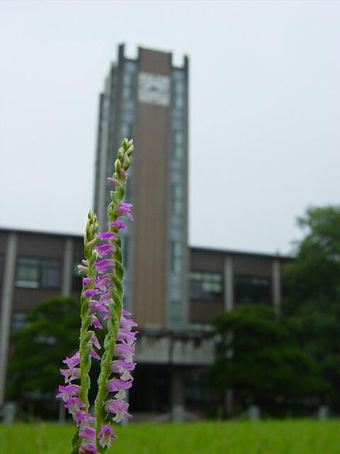 | 時計台前のネジバナ。花のつきかたや色は株によって微妙に違う。毎年、変わった形の株を探すのが楽しみだ。今年はなぜか花穂の貧弱なものが多い。 |
