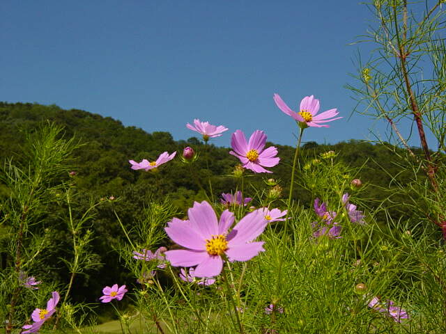 | 10月に入ってコスモスの花が見頃になってきた。背景は半田山。 |