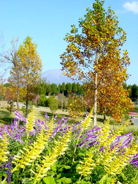「とっとり花回廊」内のサルビア畑(左)。大山を背景に、燃えるような赤の絨毯。写真右は、セージを前景としたもの。セージもサルビアの一種。これで3色揃った?