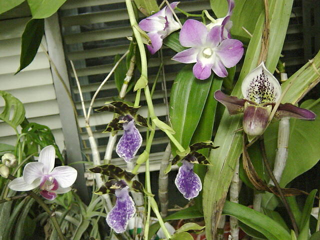 研究室の窓際で育てている洋蘭のうち4種が一斉に花を開いた。私の自慢は、これらが貰った鉢ではなく、すべて自力で育てた株であるということだ。 |