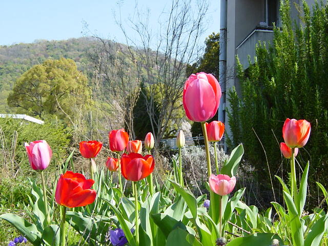 文学部西側のチューリップ。昨年4月14日の日記で「同じ球根が5年以上花を咲かせていることになる。」と書いたが、今年はさらに1年増えて「6年以上」となった。 |