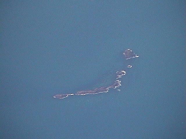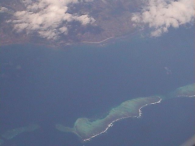 シドニーから関空までの飛行機は日本時間の10時半すぎに現地を飛び立ち、19時50分頃に関空に到着した。ちなみにこの便は、JL778便(カンタス航空とのコードシェア便だが、日航機が就航していた)。往路の便名が、ラッキーナンバーの777便となっていた。 指定された席は最も眺めの悪い真ん中の位置にあったが、空席が多く離陸直前に窓際の席に移動。南太平洋やニューギニアの様子を眺めることができた。 離陸後1時間50分ほどはオーストラリア大陸の東部上空を進む。変わりばえのしない平坦な土地が続いた。その後、ケアンズのあたりで珊瑚海(グレートバリアリーフ北端)に出る。 写真上段左は、その直後に見た島で、私の世代ならお馴染みの「ひょっこりひょうたん島」によく似た形をしていた。地元では何と呼んでいるのだろうか。右側の陸地はオーストラリア大陸の最後の部分である。 それから1分も経たないうちに、今度は、日本列島が沈没しかかっているような面白い形の島が見えた(写真上段右)。おそらく左上方向を中心とする珊瑚礁の一部なのだろう。
