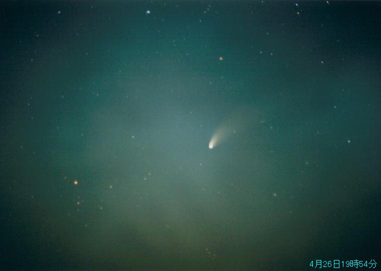 1700頃、同僚の夫婦と家族全員で、レスパール藤ヶ鳴に行く。帰りがけに、空港の北を回って、龍王塚古墳前の空き地へ。比較的透明度もよく、カペラと同じぐらいの明るさで輝いているのが見えた。双眼鏡で眺めると、視野いっぱいに尾が見える。尾の長さは3月末頃に比べると短くなっているが、太くなった分だけ、かえって見やすくなったように思う。あの明るさが急に衰えるとは思えない。5月中旬の見納めの時は、明るさを失う時ではなくて、高度が低くなって春霞の中に消えていく時なのだろう。 私自身は、まだ何度か、ここに来る予定であるが、子供たちには“もう連れてこないぞ。これで見納めだ”と言っておいた。見納めの記念写真を何枚か撮って、彗星に別れを告げた。