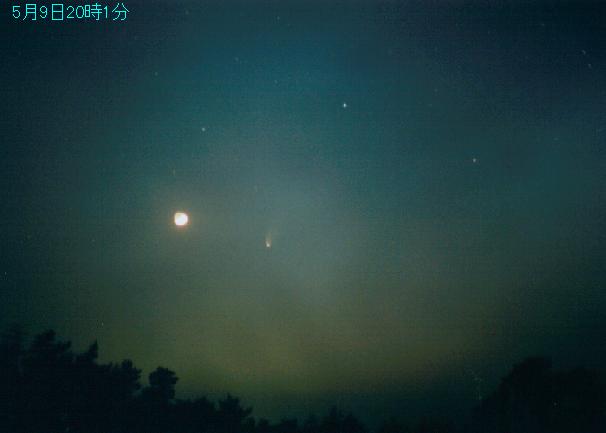 2月19日以来、素人・初心者ながら、固定撮影方式で写真を撮り続けてきましたが、これが、この彗星の最後の写真となります。露光時間を彗星のほうに合わせてあるので、左横の三日月が満月のように写ってしまいました。地球照の影響もあるようです。